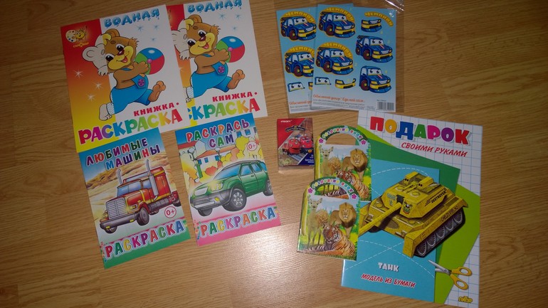 Расскраски водные по 8шт, расскраски маленькие по 1шт, с машинками по 2шт. Поделка 3D с машинкой по 2шт, Мелки 3шт, Поделка танк 4шт