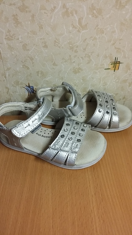 Фото 1: Босоножкии "Pediped", 24 размер, серебро, кожа на коже. Состояние отличное: ничего не сломано, не загнуто, застежки целые и хорошо липнут.