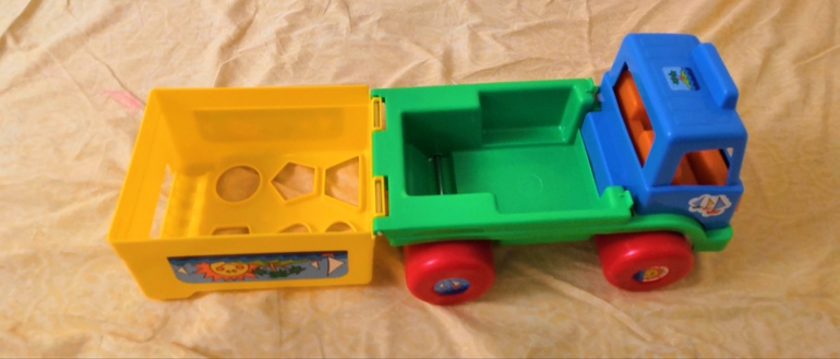 3. Машинка - сортер - все фигурки потерялись, можно использовать как грузовую машинку (кузов открывается), либо как каталку, привязав веревочку.