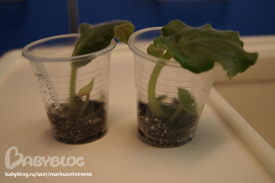 Вот фото листика уже с детками. Потом детки нужно отсадить в отдельные горшочки, и из них вырастают прекрасные фиалки.