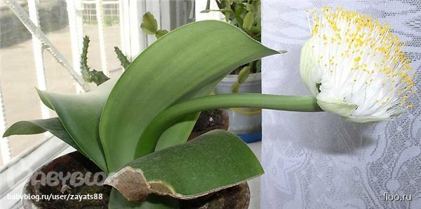 В комнатной культуре у нас выращивают гемантус белоцветковый (Н. albiflos). Растение выглядит совершенно оригинально. У него вырастают 2-4 или 6 толстых, мясистых, до 20 см длиной, широких, с закругленными кончиками листа, сверху гладкие, по краям ресницчатые, размещающиеся супротивно.
