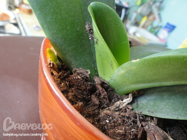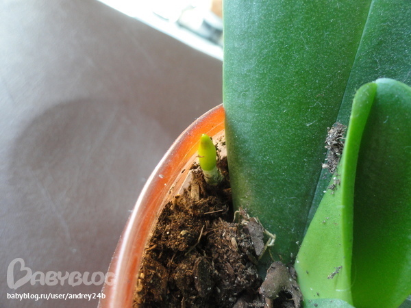 ОрхидеиДевочки, недавно отсадила от мамы взрослую детку и сейчас смотрю - и понять не могу - что там между листиков появилось))) цветоносик или корень воздушный?