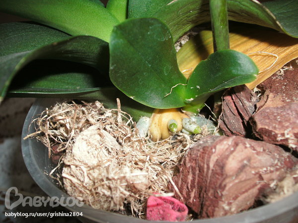 SOS! Помогите цветику!девочки, всем добрый день, возникло несколько вопросов, у моего фаленопсиса стали вянуть листья, сегодня заметила и у детки вялый лист, старые корни я удалила т.к. они погибли, сейчас корни совсем маленькие, мне кажется, что листьям не хватает влаги, еще в горшке увидела зеленые пятна, похоже на плесень, в общем не знаю недолив или наоборот.