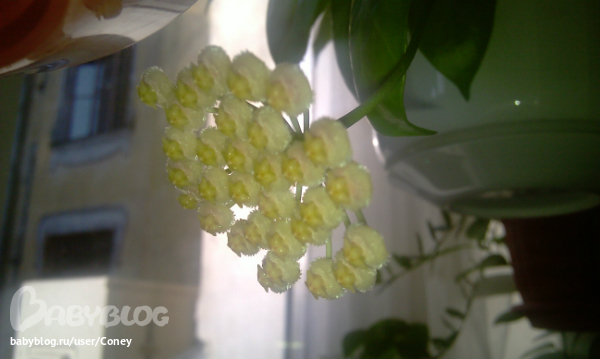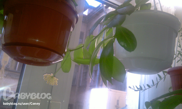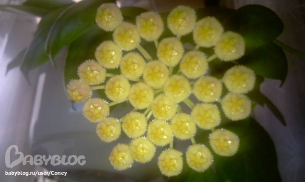Я купила у одной дамы пару черенков хойи белла, на одном черенке были цветы, так сынишка "окрестил" хойю стеклянным цветком ))) Так и зовем )) Правда, мой черенок беллы, в отличие от карнозы, сидит, думает пока...