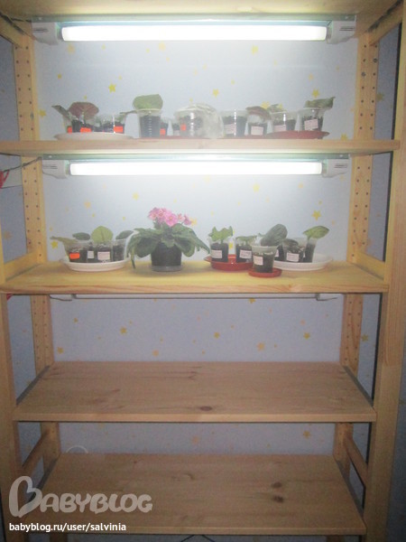 Любимый муж мне сделал СТЕЛЛАЖ для моих любимых фиалочек!!! По собственной инициативе!!! Я даже не просила!!! Это чудо какое-то!!! Сейчас у меня заняты только 2 полочки, поэтому горят лампы только над ними, а вообще лампы есть над всеми четырьмя! А еще, есть ТАЙМЕР! В общем, я абсолютно счастлива!!!