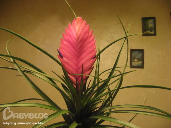 Это Тилландсия! Главной отличительной особенностью всего рода бромиеливых является то, что питаются растения практически воздухом, в прямом смысле этого слова. Как все представители бромиеливых растений, имеет ярко выраженную розетку тилландсия. Уход за растениями этого вида заключается главным образом в правильном расположении, помещение должно быть теплым и с высокой влажностью, так как розетка растения служит своеобразным резервуаром для сбора влаги.