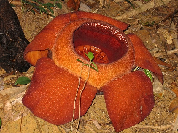 Крохотные семена раффлезии – не больше макового зернышка – разносятся животными, которые наступили на плод растения. Они внедряются под кору лиан, а через полтора года кора набухает, образуя своеобразную почку, созревающую через 9 месяцев в бутон раффлезии - «bunga patma» (на местном языке - цветок лотоса).Средний цветок в поперечнике достигает 70-90 см, размер цветка-рекордсмена – 106,7 см. Толщина лепестка среднего – 3 см, а длина – 46 см. После короткого периода цветения раффлезия в течении нескольких недель разлагается, превращаясь в отвратительную бесформенную массу черного цвета.