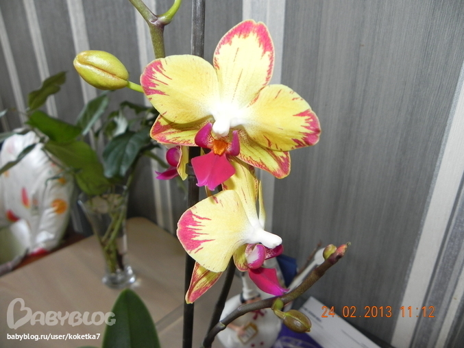 ДУ!Ну,красотка!Даже такой расцветки не видела еще))))))))))Вот и я своему сказала в свое время,чтоб деньги не тратил на букеты,а лучше цветы комнатные.Тоже сама выпросила орхидеи и он когда ездил в Москву купил этих деток
