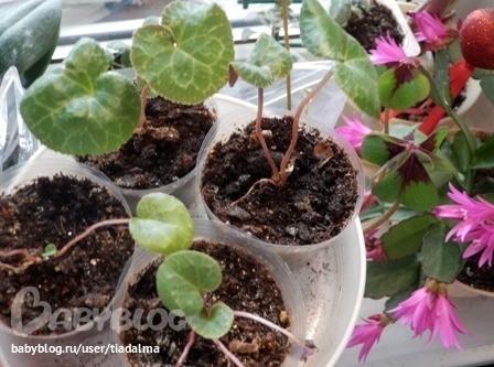 Цикламены малыши, им тоже 5,5 месяцев. Пишут, что цикламены первые полгода растут медленно, после первого рубежа, начинают набирать активность. У меня они росли медленно, хоть и стояли в прохладе. Думаю, это из-за нехватки света. Пришлось выбирать, либо прохлада, либо место под лампой)После первой пикировки сбросили пару листиков(