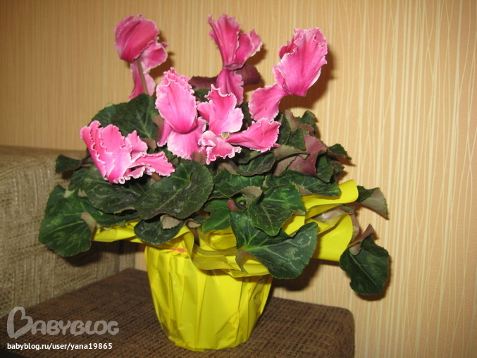какой красивый цикламен- махровенький! У меня первый умер очень быстро ибо не знала как ухаживать- залила его - вода попала на клубень и он сгнил. Сейчас живут у меня 2 штуки - живут на северном, пролхадном окне, поливаю толкко в поддон раз в неделю. Прям ставлю в чашку пока земляной ком не пропитается, минут на 10оставляю чтобы напился, потом вытаскиваю и все. У меня они еще посажены так что клубень на 1/2 в земле.