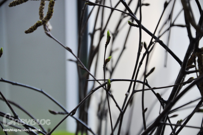 А еще поставили много нарезанных веток березы. Пока они не очень красивые, но уже в процессе распускания листиков:)