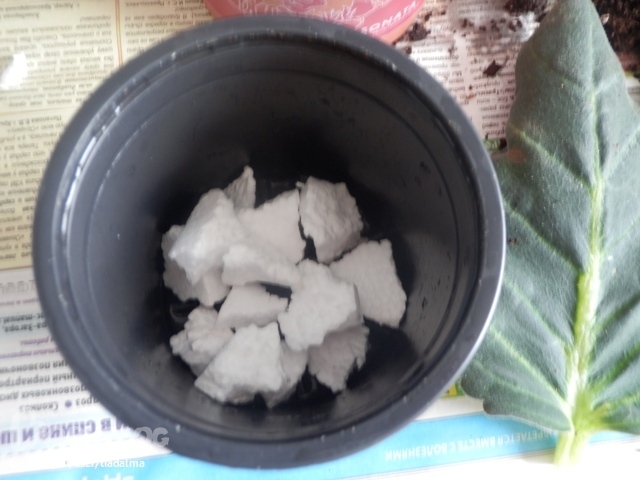 Горшочек берем примерно 9см. в диаметре (для рассады к примеру), этого хватит, если клубень не большой. А как правило клубень у таких растений со спичечную головку( Сыплем дренаж, в моем случае это пенопласт)