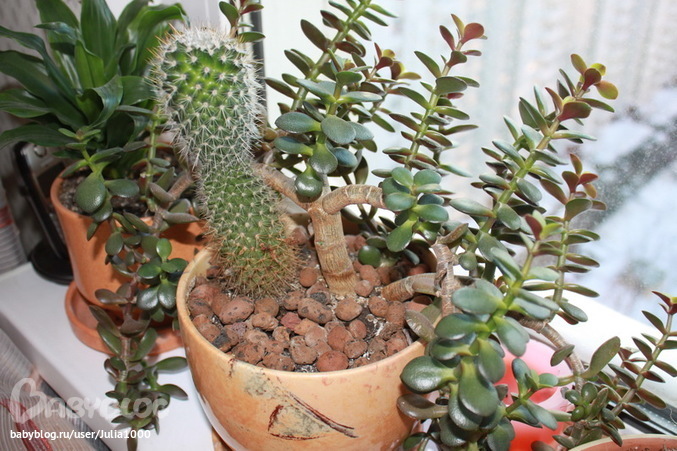 РазноеПять лет назад мы привезли из Испании купленный в местном Ботаническом саду маленький горшочек-микс, там было 2 маленьких кактуса и один отросточек денежного дерева. Правда, один кактус у нас повредился при перевозке. Но 2 оставшихся растения нормально себе так растут. Сейчас это выглядит так: