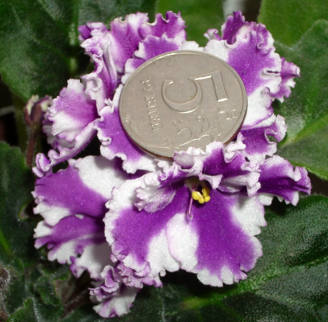 Фиалки/Глоксиниипосле тяжелой для моих фиалок зимы (жара от батареек и холод из форточки),они начинают понемногу зацветать. причем в этом году просто огромными цветами(монетка для примера)