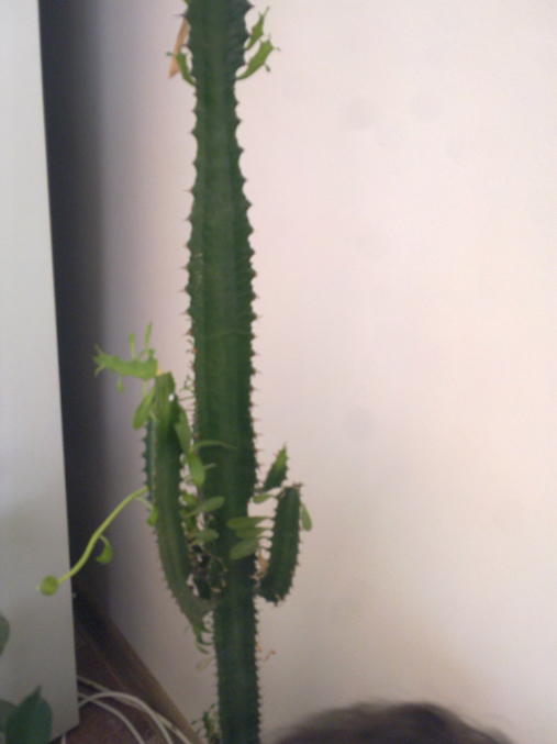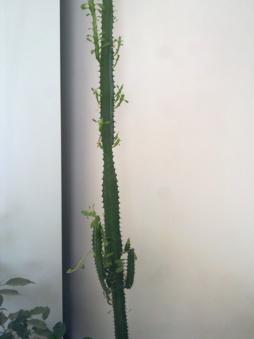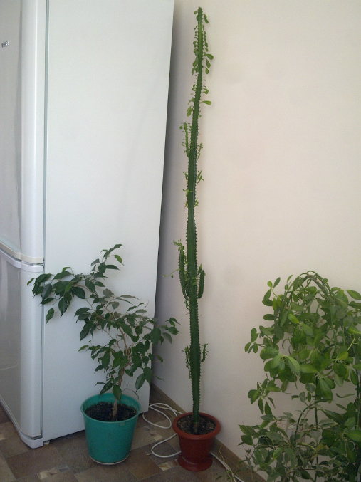 Вот мой синадениум , один из любимых цветков . Он прекрасно и без опоры растет . Вашему не хватает света и влаги . Я через поддон поливаю . А тот что 2.5 м тоже из молочайных .