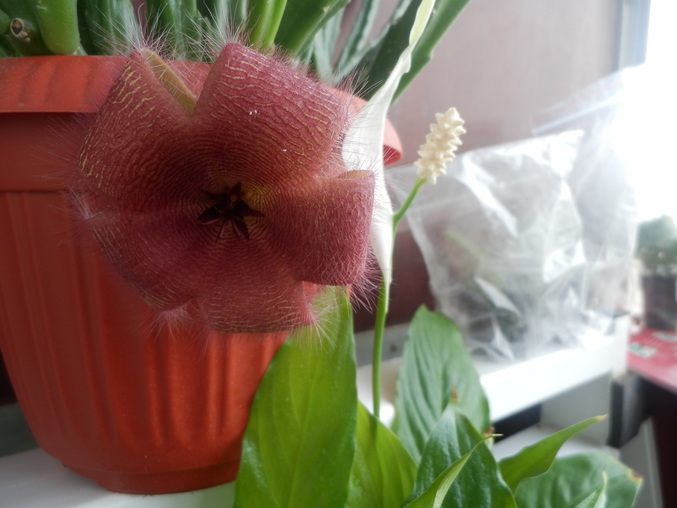 Цветочек стапелии и спатифилума вместе) Гремучая смесь)) Один цветочек источает нежный и приятный аромат (люблю аромат цветов спатика), а другой мохнатый "шмель" пахнет неочень