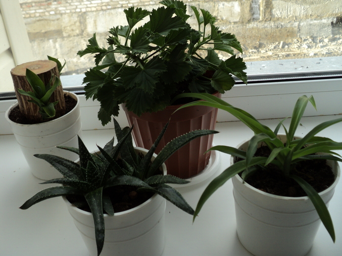 драцена (муж привез из сочи в виде заплавленного в прафин пенька, до сих пор нет корней, зато два ростка), герань, хавортия и снова хлорофитум