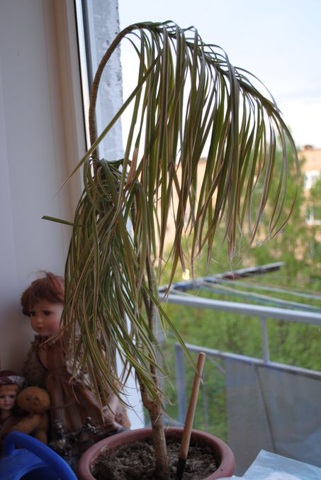 SOS! Помогите цветику!росла росла и тут начала падать, не вянет, но гнется :((((сушила землю, поливала, подкармливала, пересаживала, но ничего не помогает. пальмочке 7 лет всего