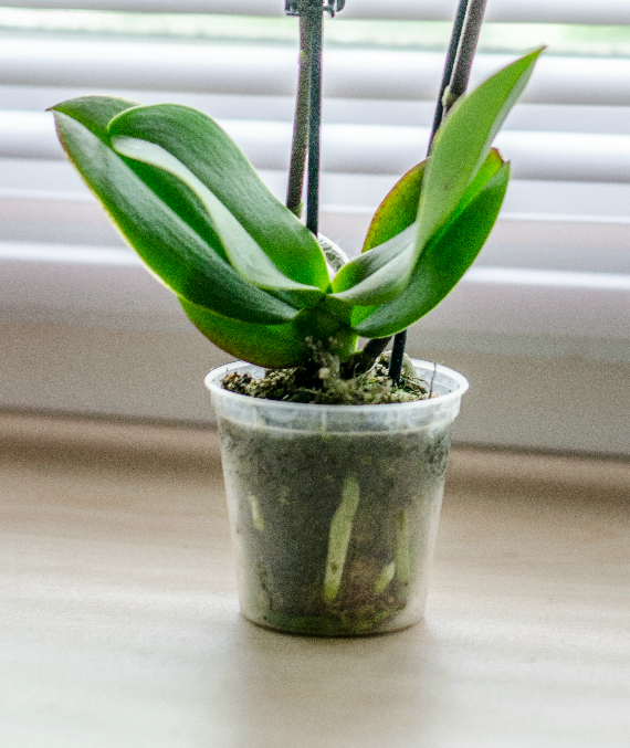 Такого маленького горшка я не нашла, но друг дал небольшую емкость для смешивания автокрасок, она чуть больше предыдущего горшка. Его внутри лучше промыть горячей водой, а в стенках и дне сделать гвоздем отверстия (около 5 мм в диаметре). После я насыпала на дно мелкого керамзита, так чтобы дно было прикрыто, присыпала чистой корой сосны, затем самый большой слой готовой смеси для орхидей "Скорая помощь", сверху - чистая кора. От покупки до пересадки прошло 2 месяца, с тех пор еще 5 месяцев. Но у меня все мини-фалики неторопливые какие-то. Вот так сейчас выглядит. Кстати, мой совсем мелочь, листики в длину сантиметров 7.
