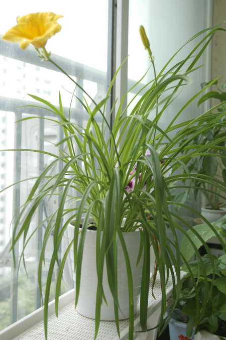 Лилейник. Вообще-то он не комнатный, конечно. Растет у нас на улицах вдоль дорожек обычно. Но на улице просто ходишь мимо и не обращаешь внимания. А дома, в горшке, выглядит очень красиво, на мой взгляд. Даже и без цветов. Цветочки тоже яркие, красивые и большие. Только вот отцветают очень быстро, практически за день. Но бутонов на нем много, поэтому в общем получается, что цветет довольно долго.