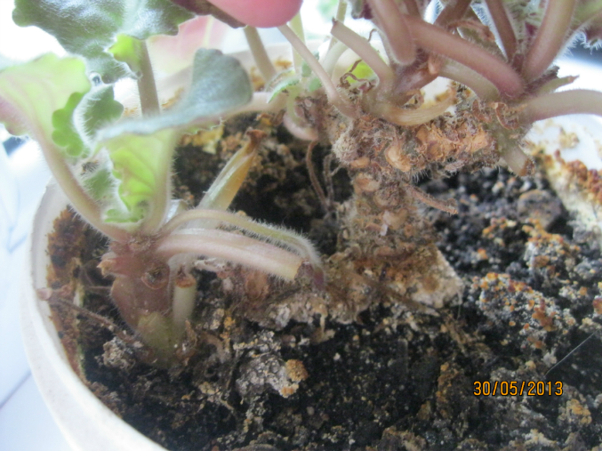 ножом разрезайте не бойтесь и стволик зачщать надо как морковь от ороговевших чешуек, в ю-тубе есть видео на них подробно показывается как производить продцедуру(омоложение взрослой фиалки называется)