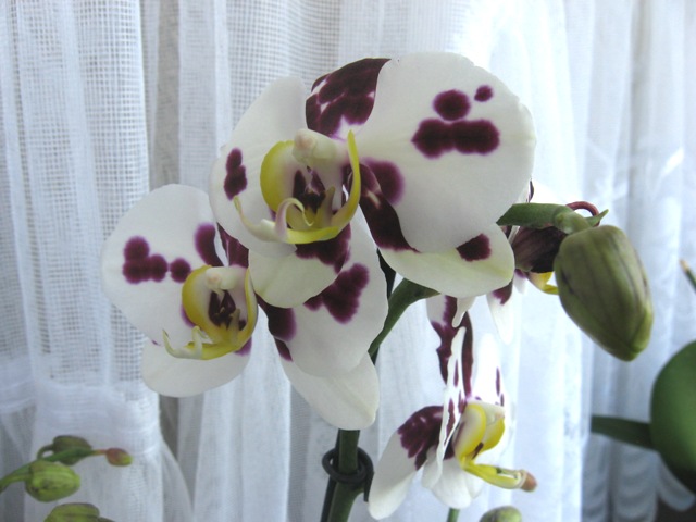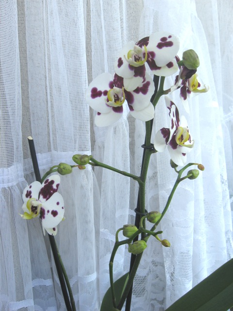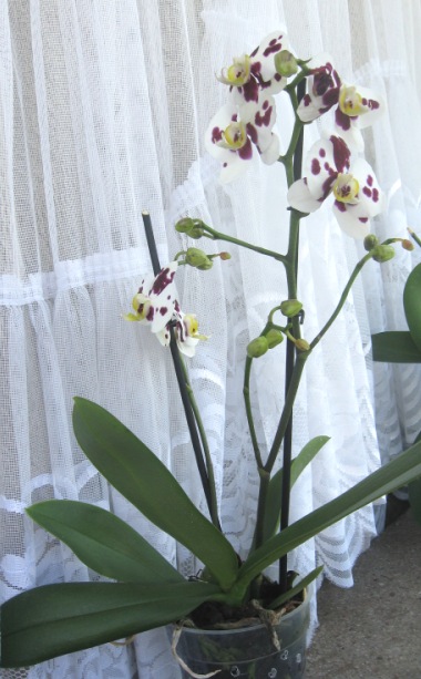 Расцветших цветков пока 6, но бутонов на ней полно, на одном цветоносе нет ответвлений, на втором верхушка с бутонами и три ответвления, так что в общей сложности у нее 5 цветоносов! ))) Правда, 2 бутона уже отвалились и 2 скоро отвалятся, но они такие были с самого начала, а остальные ничего так пока, бодрячком! Я ужасно рада, хотела именно такую в крапинку! И еще хочу персиковую, и еще белую с фиолетовыми прожилочками, и еще бледно-салатовую, и еще... и еще... ))) Ну, вы меня понимаете! )))