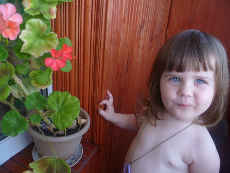 было у меня две герани - одна красная другая розовая. Розовая стала чахнуть и я подсадила ее к красной. В горшке у красной она все-таки благополучно "скончалась" зимой. и осталась одна красная. Начала она цвести и вот что получилось: