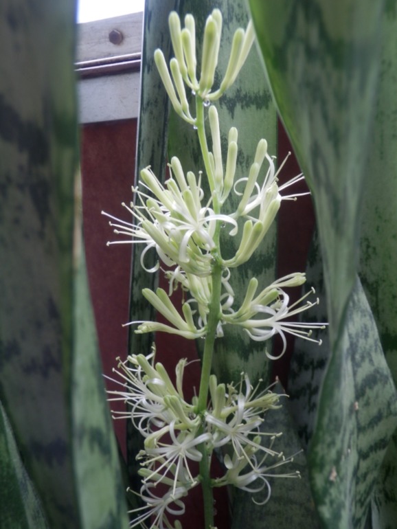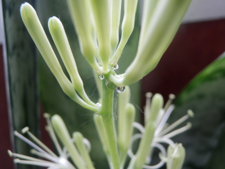 Третья красотка - сансочка. Зацвела тоько в прошлом году впервые за многие года проживания с мужем) Это поистине его цветок, наш домовенок) В этом году выпустила 3 цветоноса и активно пускает деток. Аромат очень сильный, медовый. Цветок - стандартный колосок, цветок один за другим распускаются, пока остальные ранее цветущие вянут. Оттого и кажется, что цветет она все же долго)