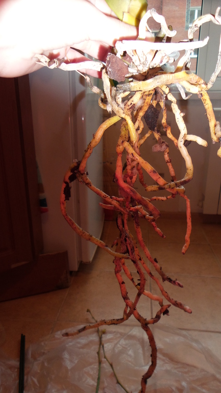 Когда достала цветок все корни были желтыми. Обрезала и обработала корни толченым углем. Вот что получилось.