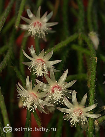 это не хатиора. Это рипсалис, родственник шлюмбергера и рипсалидопсиса, тоже эпифит. Укореняется легко, либо сегментом, либо целой веточкой.Можно укоренить в песке, грунте легком и торфяном (накрывая баночкой), либо в водичке целые веточки.