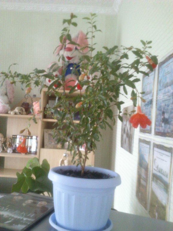 До плодоношения далеко. Цвёл бы. Растения-гранаты, купленные в цветочном магазине, плодоносят мелкими плодами, размером меньше куриного яйца. А как будет плодоносить, выращенный из настоящего, предположить трудно.