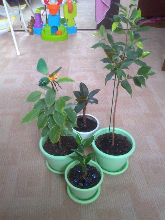 А это мои фикусята - малыши. Экспериментирую с ними, один заплела в косу, другой обрезала, третий хочу вырастить в виде шара