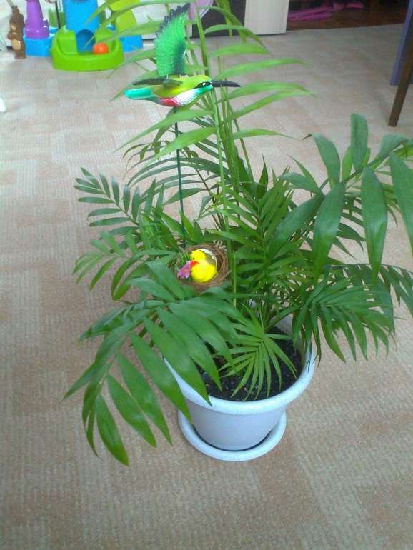 14 лет назад отдыхала в Казахстане. Перед отъездом случайно зашла в цветочный магазин и увидела её - Хомедорею Изящную, это была любовь с первого взгляда. Везла через две границы, боялась, что пограничники не разрешат провезти. И вот она поселилась на моем подоконнике. Росла не по дням, а по часам, сейчас её рост примерно 1,3 м. Так как дома у меня много цветов, ставить не куда, пришлось мою любимку перевезти на работу, теперь она радует своим видом весь мой коллектив.