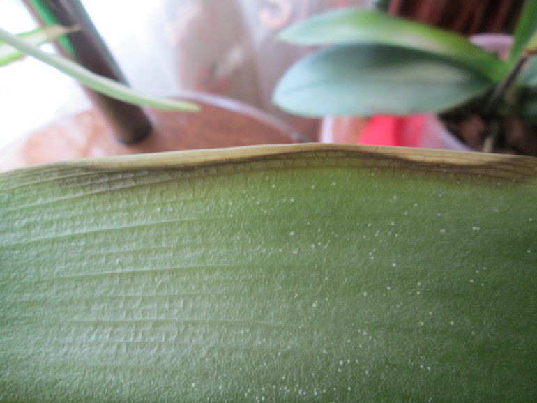 ОрхидеиПриехали из отпуска 2 недели как и за эти 2 недели орхидея которые старательно поливала моя мама (3 раза за 3 недели) начали меняться. С листьями явно что-то не так - и желтели и коричневели, так еще и белые точечки пошли. Знаю, что один раз их поставили на палящее солнце, на следующий день переставили от окна, но то ли ожег уже произошел, то ли перелив, но с листьями явно что-то не так. Кто в этом разбирается, как думаете что это?