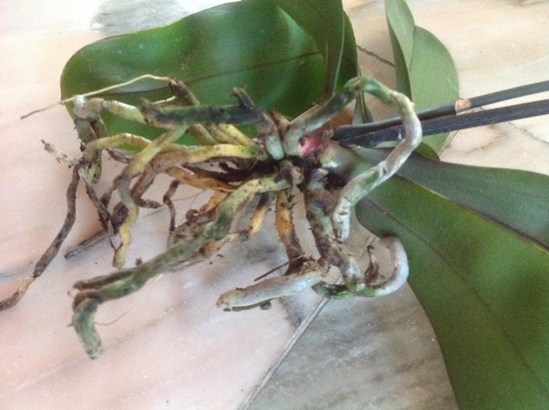 все что сухое и не упругое на ощупь — обрезайте. например берешь корень — а он расползается и посередине ниточка такая — это гниющие. до живого места обрезайте. по центру корни (желтые которые) — если упругие, то не трогайте. желтые они потому что свет туда не попадал, но они живые )