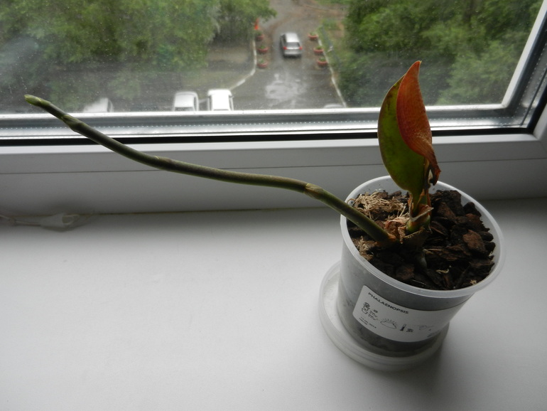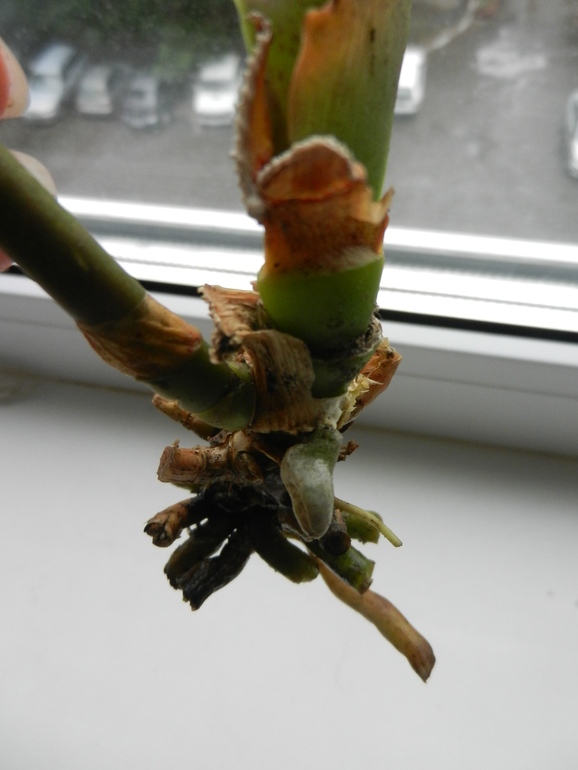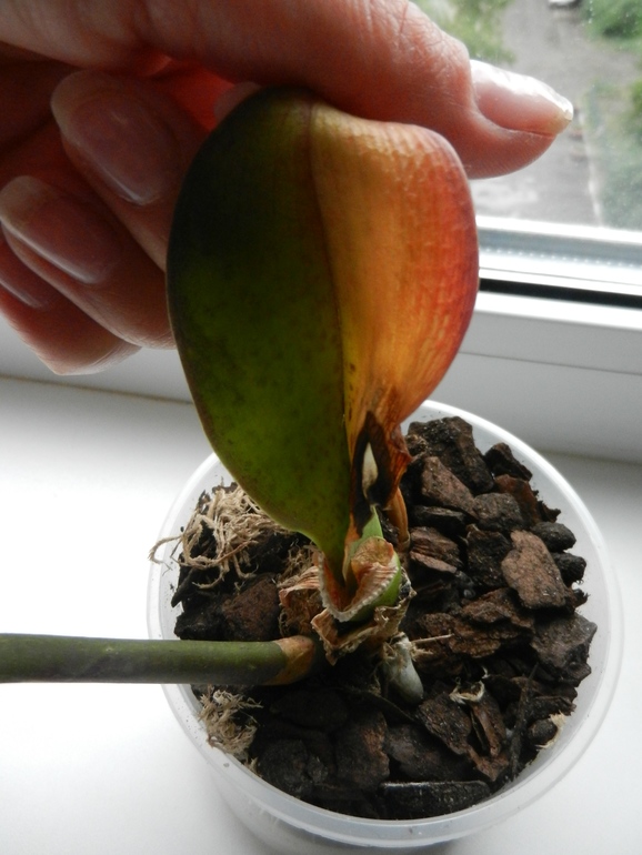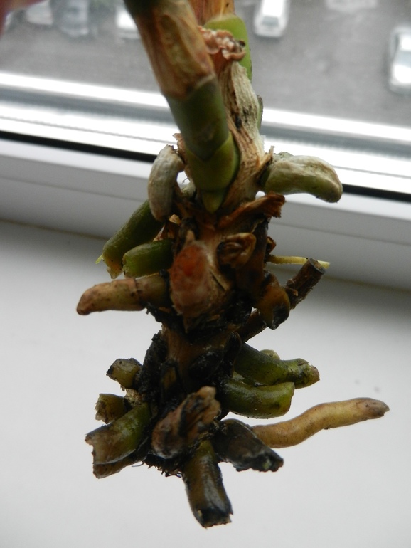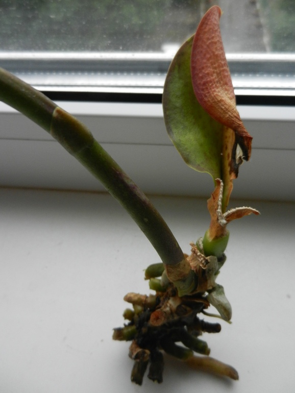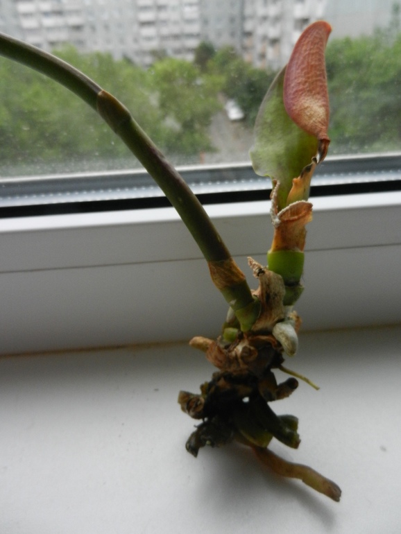 Корневая система была мощная, но к сожалению, простояв в воде корни превратились в водоросли. Листья были у же обрезаны. Остался один листочек и тот был повреждён. Есть цветонос упругий такой. Точка роста от куда растут листочки плотненькая, упругая. Проклёвываются пару новых - свежих корешков.