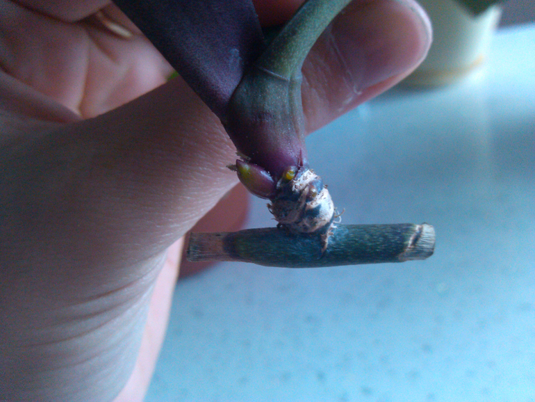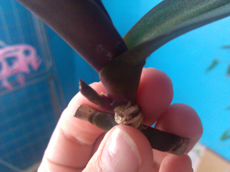 ОрхидеиВыросла детка на моей первой орхидейке, росла с ноября по июнь, и даже цветочек дала по началу. Корней все не было, потом цветонос, на котором она была, стал желтеть...пришлось детку экстренно "снимать". Опрыскивала ее, сидела она во мху. Периодически конечно тянулись руки глянуть, что там с ней))и вот что то появилось, я обрадовалась- корень))перед выходными было выпячивание приличное, после выходных приехала домой- а там вот оно что). На первой фотке- до выходных, на второй и третьей- после выходных.