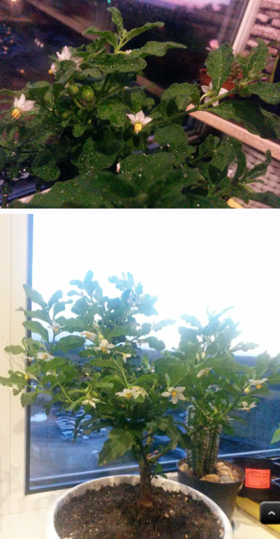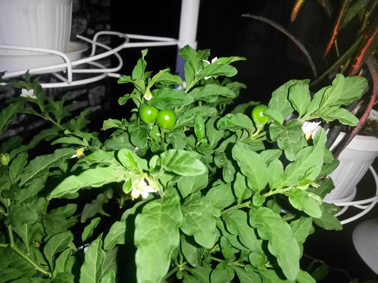 Купила в мае себе игрушку Паслен..Вот это забава-высматривать сначала цветочки, потом поцелуйчики между цветочками и вуа-ля)) ягодки. Пока зеленые , ну ничего)))