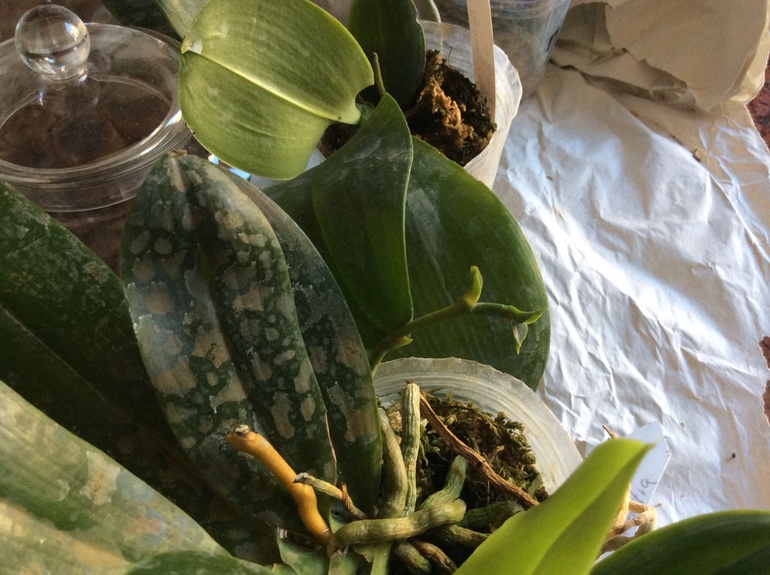 В целом состояние растюшек хорошее, пока не доставала, но много воздушных корней хороших. На виолке детка внушительных размеров и что-то еще, может цветонос?