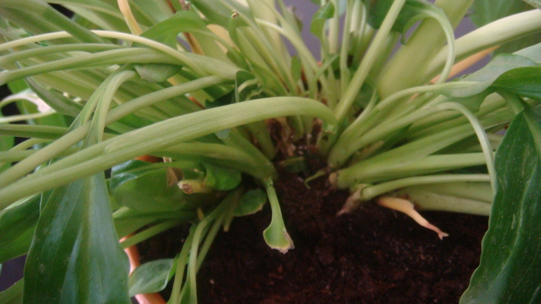 Нет, не болел. Уже года полтора он у меня, с тех пор и рассаживала деток от него, сейчас цветет вот)Вытащила его из горшка, под кран подставила ведро, не сильной струей воду включила и тихонько смывала транспортировочный грунт, чтобы корни не повредить. Ведро для того, чтобы ванну не уделать, потом просто воду в унитаз сливаю и все. Торф смыла, в готовый горшок слой дренажа, слой земли, потом спатик в центр, корешки расправить и сверху землей досыпать, чуть утрамбовать, еще досыпать и готово)