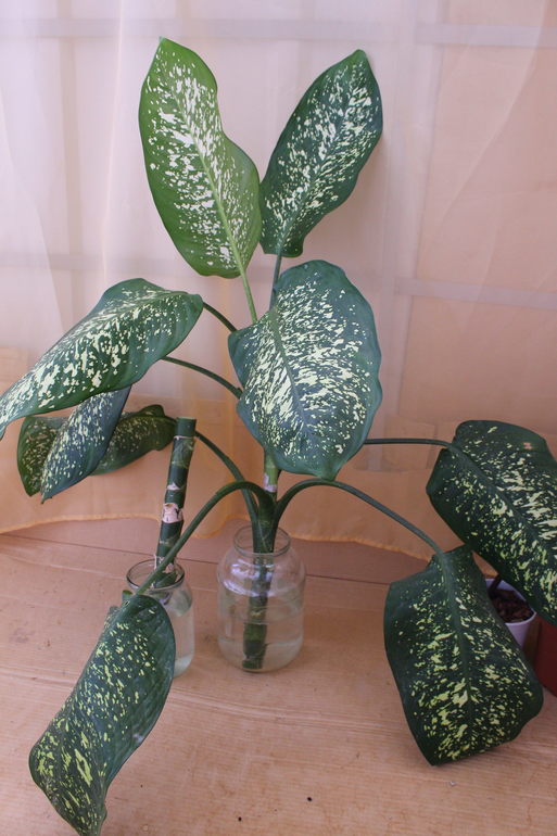 Я тоже недели две назад чиркнула диффенбахию))) Сейчас уже корешки пустили см 5. Думаю верхушку оставить только. Ствол уже толстый и будет более устойчивее стоять. А из голого ствола всего 6 штук нарезала, вот теперь не знаю куда девать... Пенек же пустил две росточки. И баночкой я не прикрывала)))