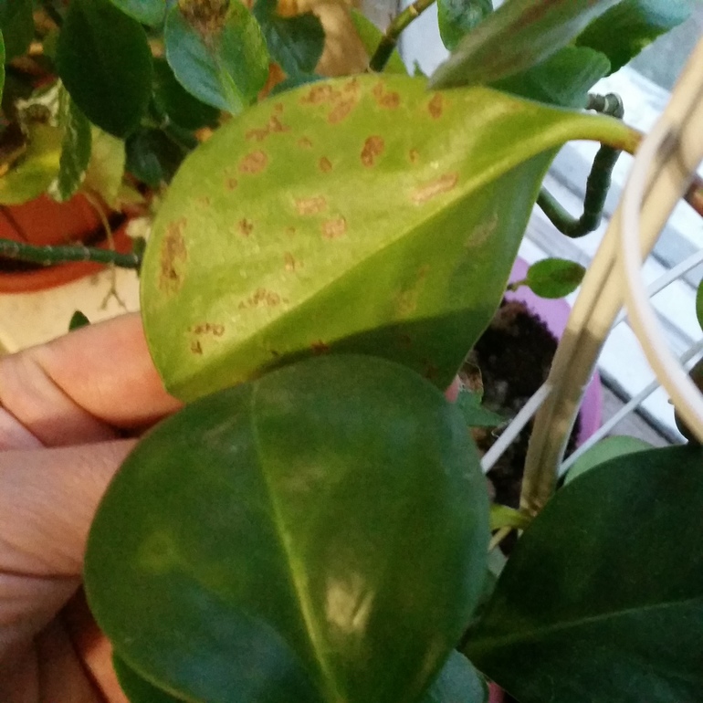 На окне стоят каланхоэ и вот этот цветок , заболел в начале каланхоэ , потом стала замечать что эта жуть перекинулась и на второй , оба покрываются этими пятнами (( листья опадают ! Боюсь что перекинется на фиалку и драцену (((