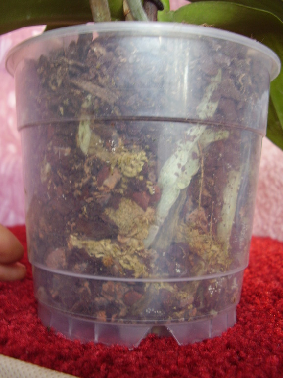 белое внутри горшка-это грибы паразиты! у меня такие были, пришлось срочно пересаживать орху в новый грунт, горшок и хорошо промывать корни