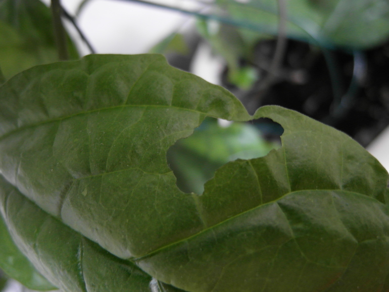Вы дольку огурца или яблочка положите рядом на землю. Думаю, не долго ждать придется), если не уполз далеко. Такие повреждения наносят обычно случайные насекомые, которые залетают с улицы, ничего страшного.
