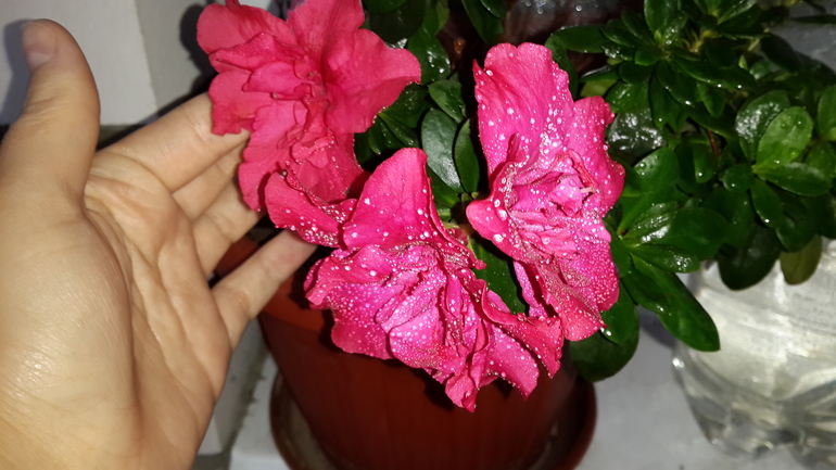 очень красивая! только зря вы на цветочки водой набрызгали — потемнеют((( моя никак не зацветет — бутоны начинает распускать и сил не хватает ((( с конца июня мучается. дома колотун, но все равно что-то не нравится ей.