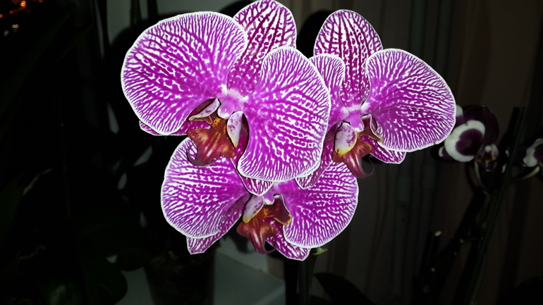у меня такая была.... была потому что отцвела и новый цветонос вышел с белыми цветами и желтыми прожилками, красят эти орхидеи и как только перестает краситель поступать не будет такого цвета. (так же и с розами делают). А так точно такая и была при свете дневном более фиолетовая при искусственном освещении более синяя.