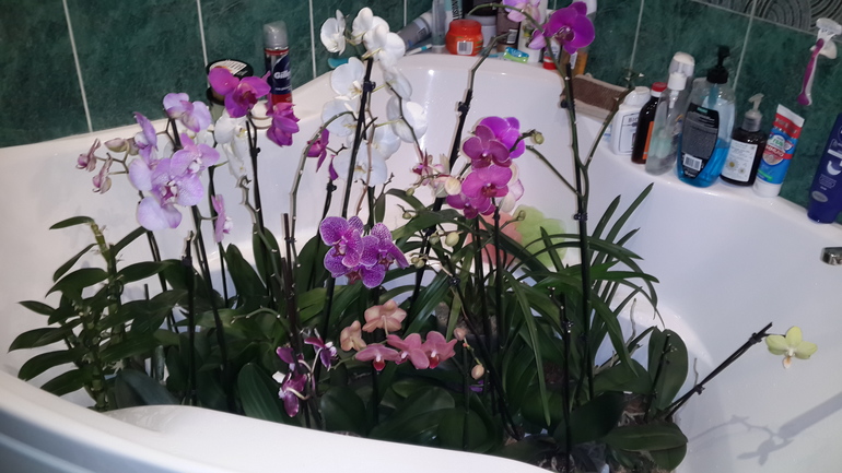 Спасибо)))) Ставлю в ванну и включаю им теплый душ (этакий эффект тропического дождя), ванну закрываю. Так они стоят минут 20-30. Потом воду спускаю, Промокаю сердцевинки чтоб вода не осталась, а то загниют. До утра постоят в ванной подсунут, а утром по местам.