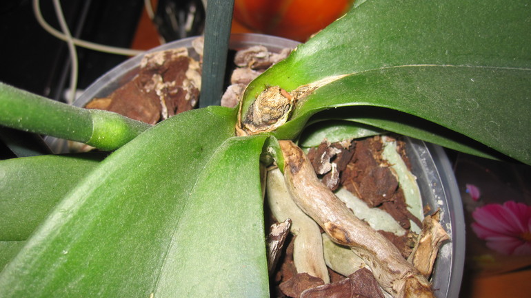 у орхидеи сначала серединка подгнивала, потом два листика пожелтели и отвалились(((Серединка сейчас такая и не видно, чтоб листочки новые росли. Достала ее из горшка, корни внутри желтые(((