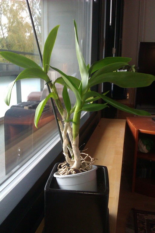 Это дендробиум. С корнями у него все хорошо и само растение в порядке. Прозрачный горшок ему не нужен, это не фал!!! Субстрат должен быть более влагоемким, чем для фалов, т.е. в кору можно добавить перлит, торфа немного, мха немного. Дендр не держит влагу в корнях как фал. Но и застоя воды не терпит.