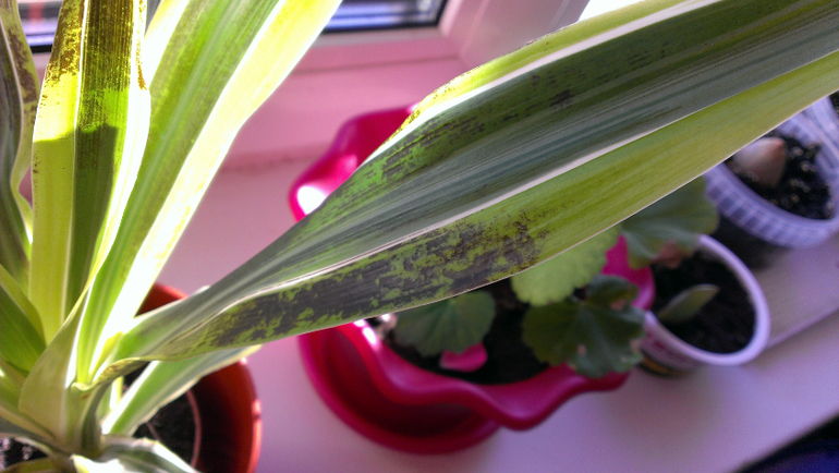 Так вот... Когда выбирала, листочки все были чистые. Уже в машине стала замечать какие-то пятна на листьях. Расстроилась, что не заметила при покупке. Приехали, поставили машину в гараж и пошли домой. Уже дома обнаружила, что все листья поменяли цвет. стали какими-то коричневыми. Я погрешила, что это реакция на холод. На улице было 0 градусов и шел мокрый снег. Думала, дома драцена отогреется и все пройдет. Но ничего не прошло. Листья плотные, крепкие, но в пятнах.